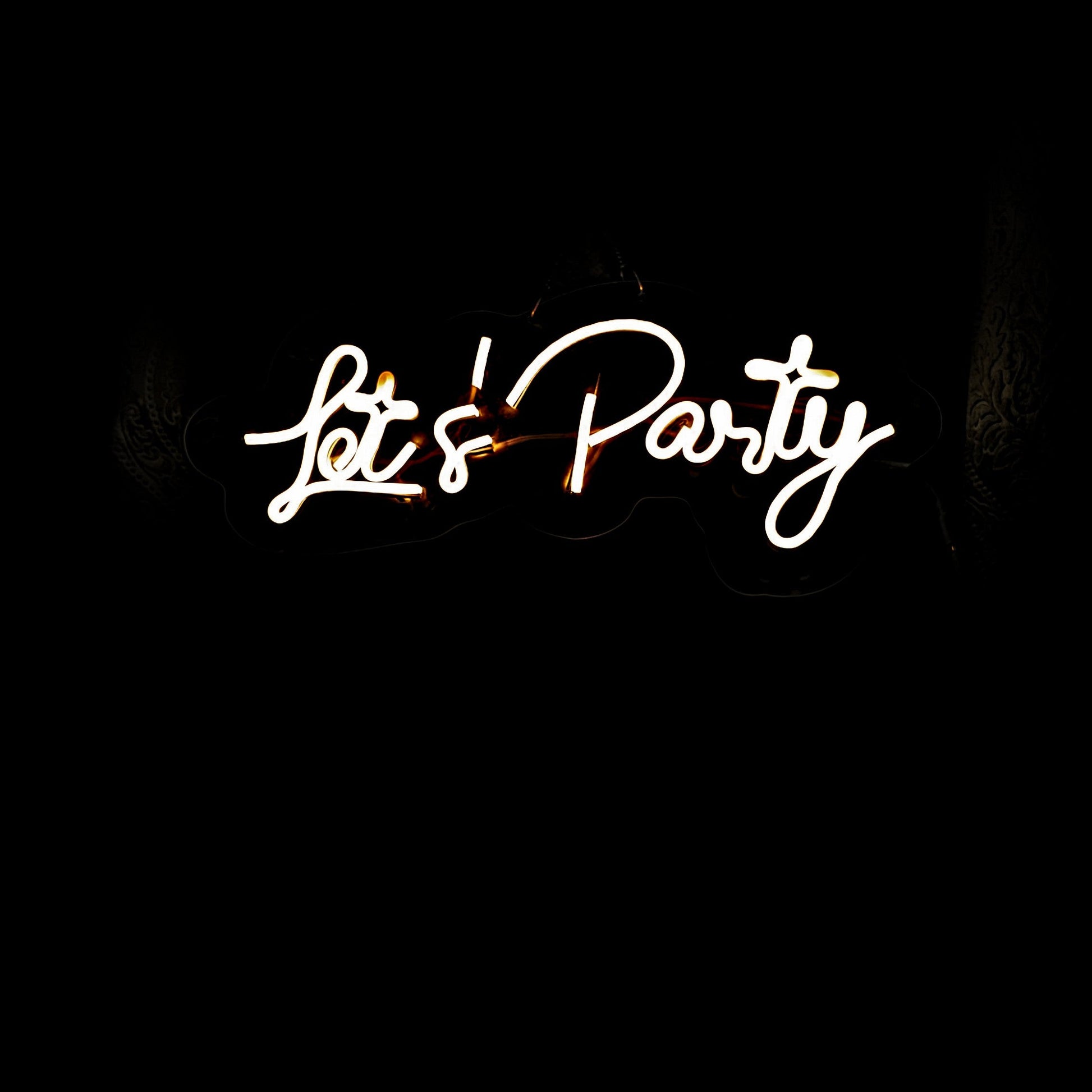 LED “Let’s Party” neon sign with acrylic backing, hanging chain & power adapter — ideal for parties, décor walls, and photo setups.