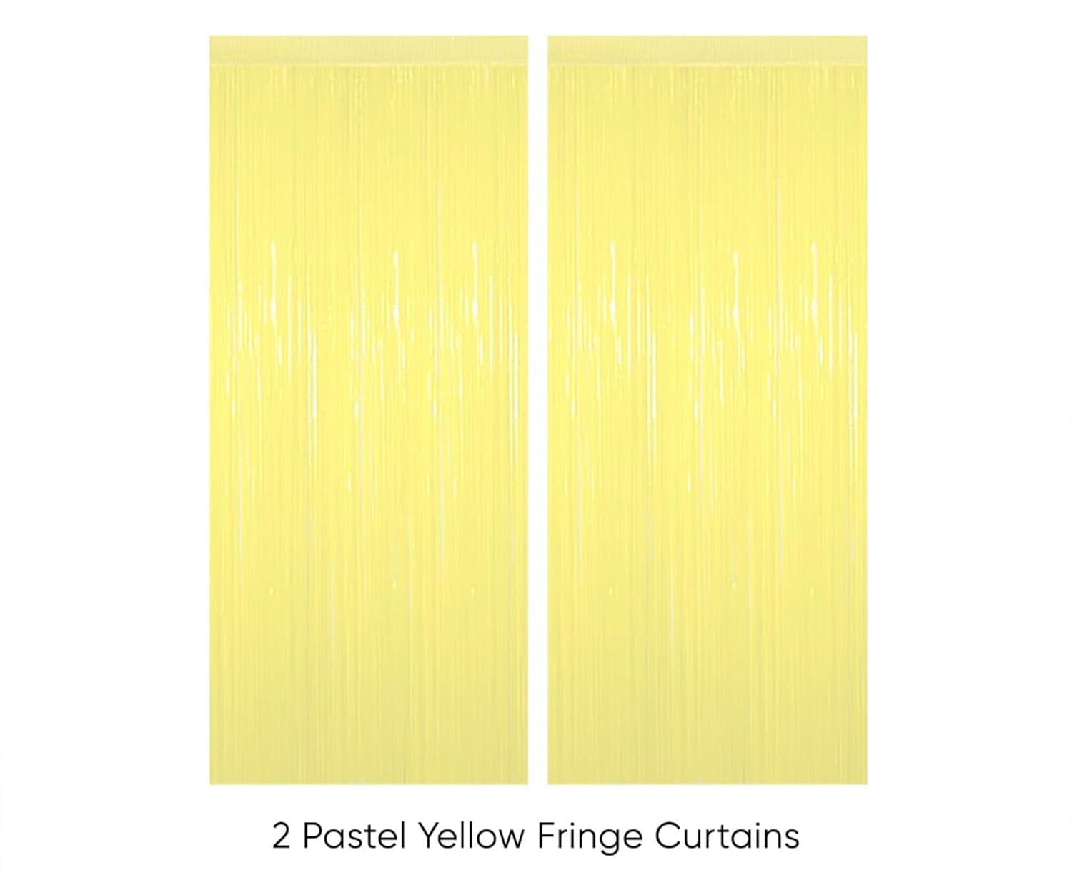 Soft pastel yellow foil fringe curtains! 2-piece set creates a sunny, gentle backdrop for baby showers, spring parties, Easter, and gender-neutral celebrations.