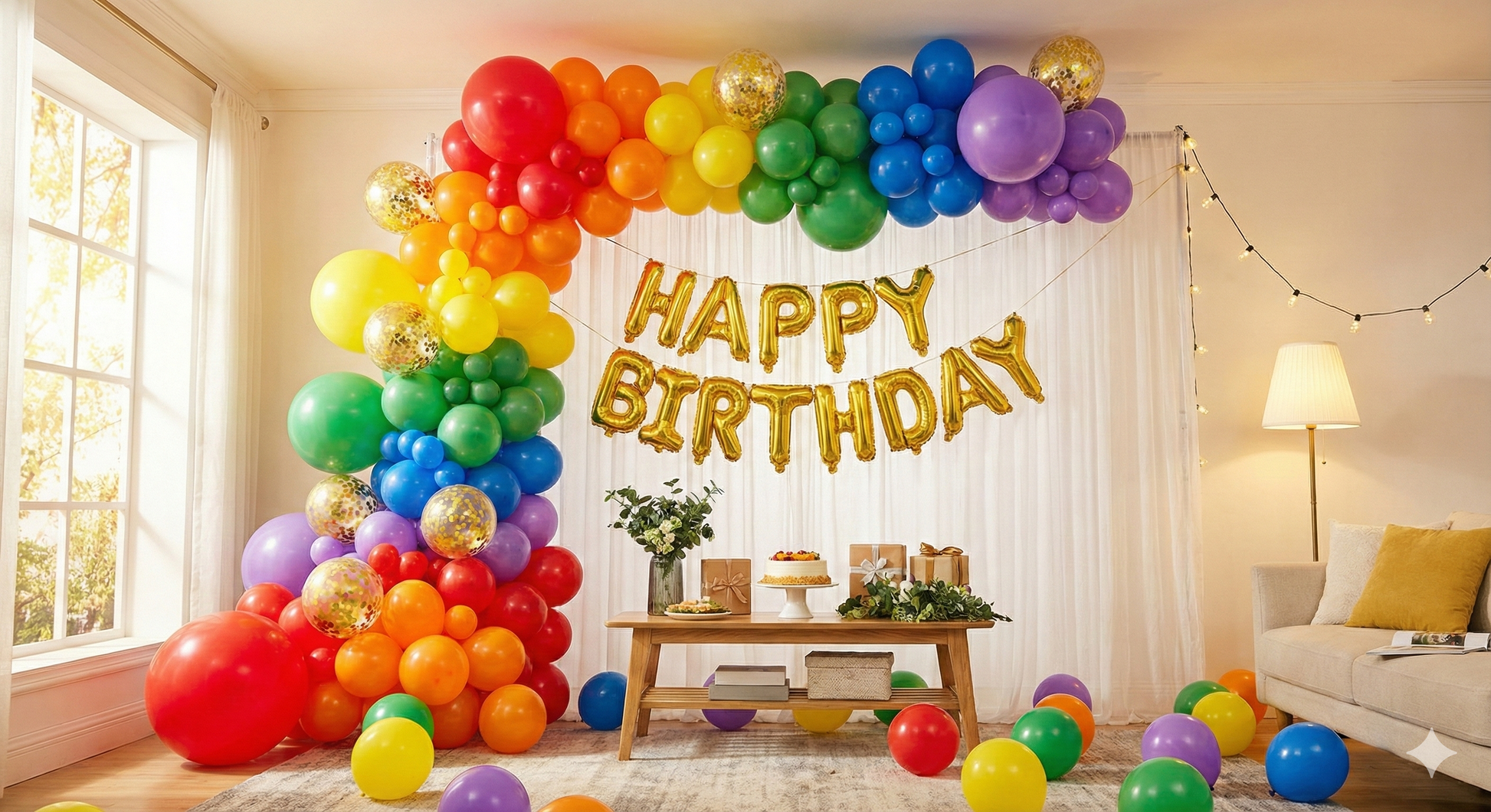 The set includes 125 vibrant rainbow balloons, gold "HAPPY BIRTHDAY" foil letters, and a soft net curtain backdrop to give your celebration a premium Pinterest-style look.